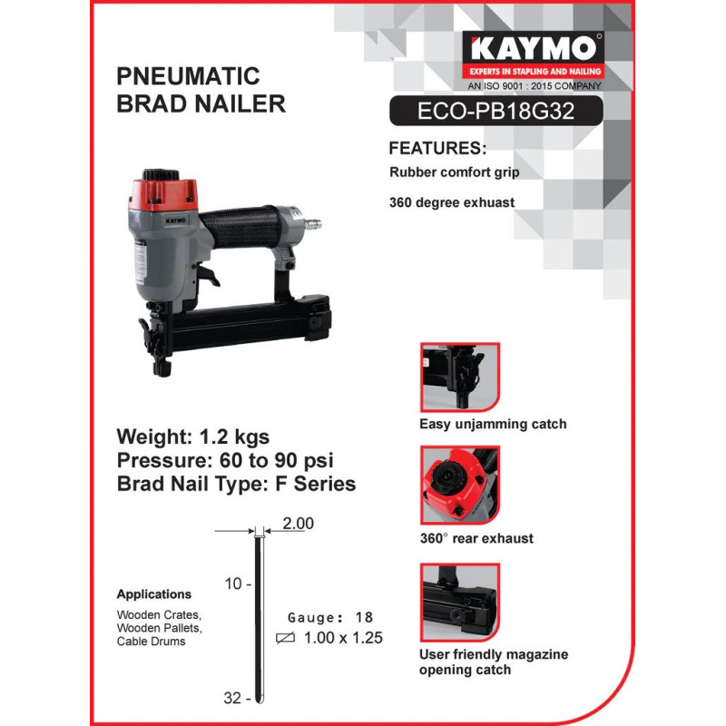 The Kaymo ECO 18G32 Pneumatic Brad Nailer is a reliable and efficient tool designed for heavy-duty nailing applications. It is widely used in various industries and offers several notable features: